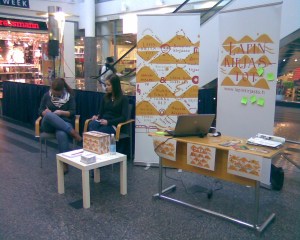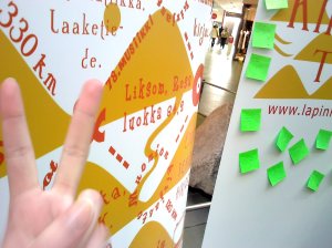 Seuraavana päivänä vahvistimme aamulla unenpöpperöisinä uusien lasten luukkukirjojen luukkuja. Homma sujui nopsaa ainakin toisella meistä, heh. Kymmenen aikoihin lähdimme kävelemään hyytävään pakkaseen kohti Sampokeskusta. Siellä kyselimme ihmisten mielipiteitä ja palautetta kirjastosta ja sen verkkosivuista. Siinä sivussa jaoimme tekemiämme askartelupaketteja. Ihmisiä kävi noin 1,5 henkilön tuntivauhdilla. Sekin tuli siinä vilinässä laskettua.