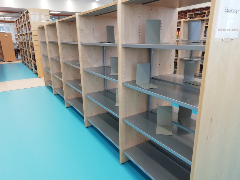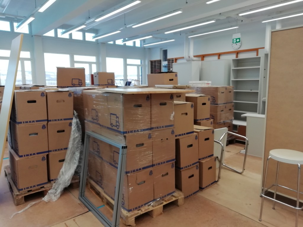 Kaikki aineisto ei ollut mahtunut väistötiloihin, joten suurin osa aineistosta ja kalusteista olivat odottaneet varastossa uusiin tilohin pääsyä. Tästä syystä oli oltava tarkkana, mihin mitäkin alkuvaiheessa sijoitellaan, jotta hyllyjen kokoaminen ja aineiston yhdistäminen taas yhdeksi kokonaisuudeksi olisi mahdollisimman vaivatonta. Vielä kun johtajan vaihdoksen myötä hyllyjärjestys koki muutoksen, oli välillä haasteellisia hetkiä, että mitä tuleekaan mihinkin ja miten aineisto sijoitellaan.
