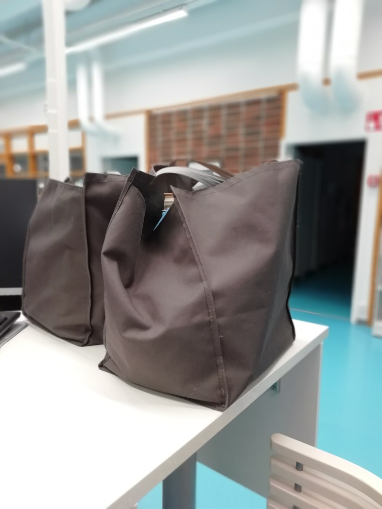 Kirjat kulkevat toimipisteestä toiseen tukevissa kasseissa.