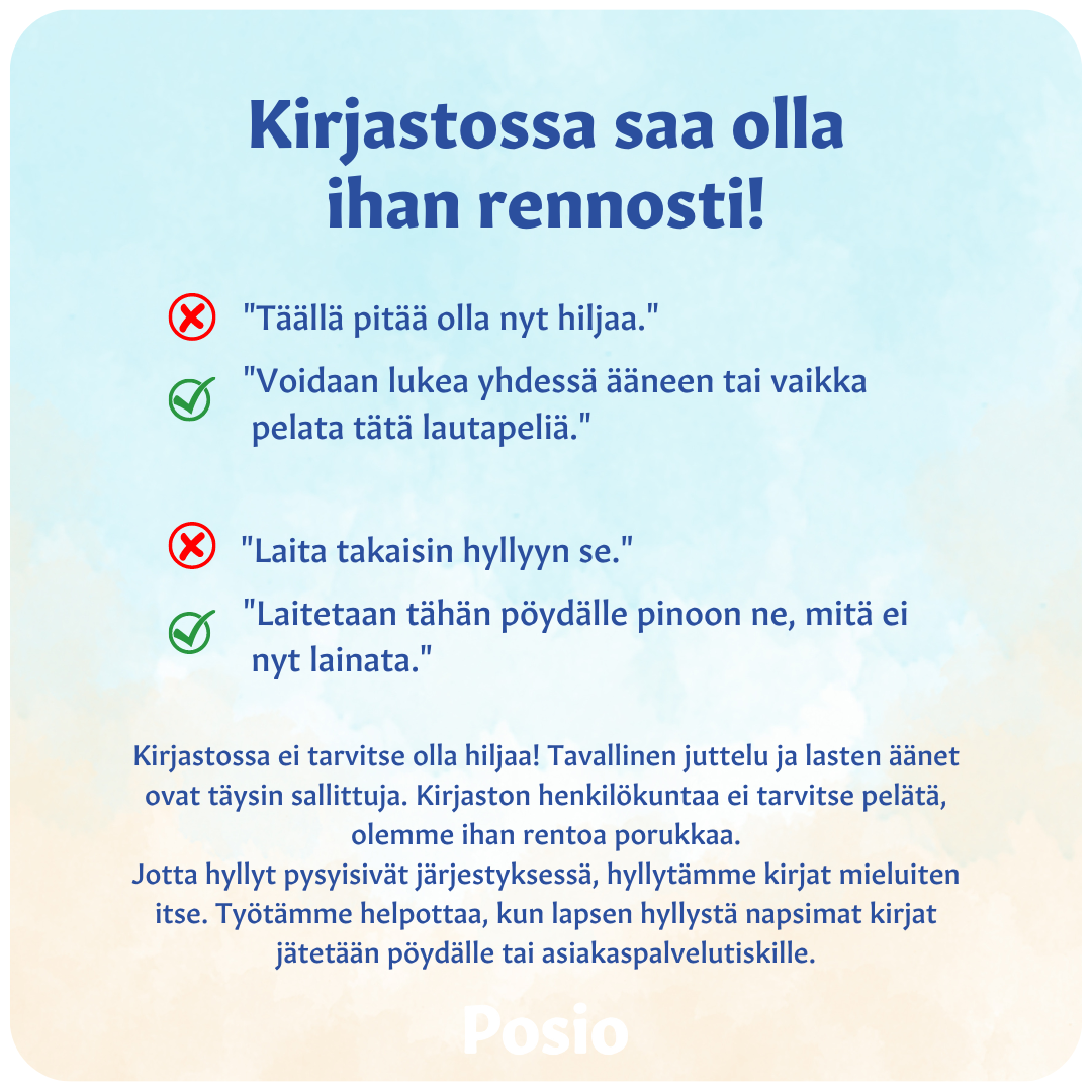 Kirjastossa saa olla ihan rennosti! Lapsia ei tarvitse hyssytellä, kunhan meno ei mene ihan mahdottomaksi. Lapset pitävät harvoin sellaista meteliä, jonka kirjaston henkilökunta katsoo