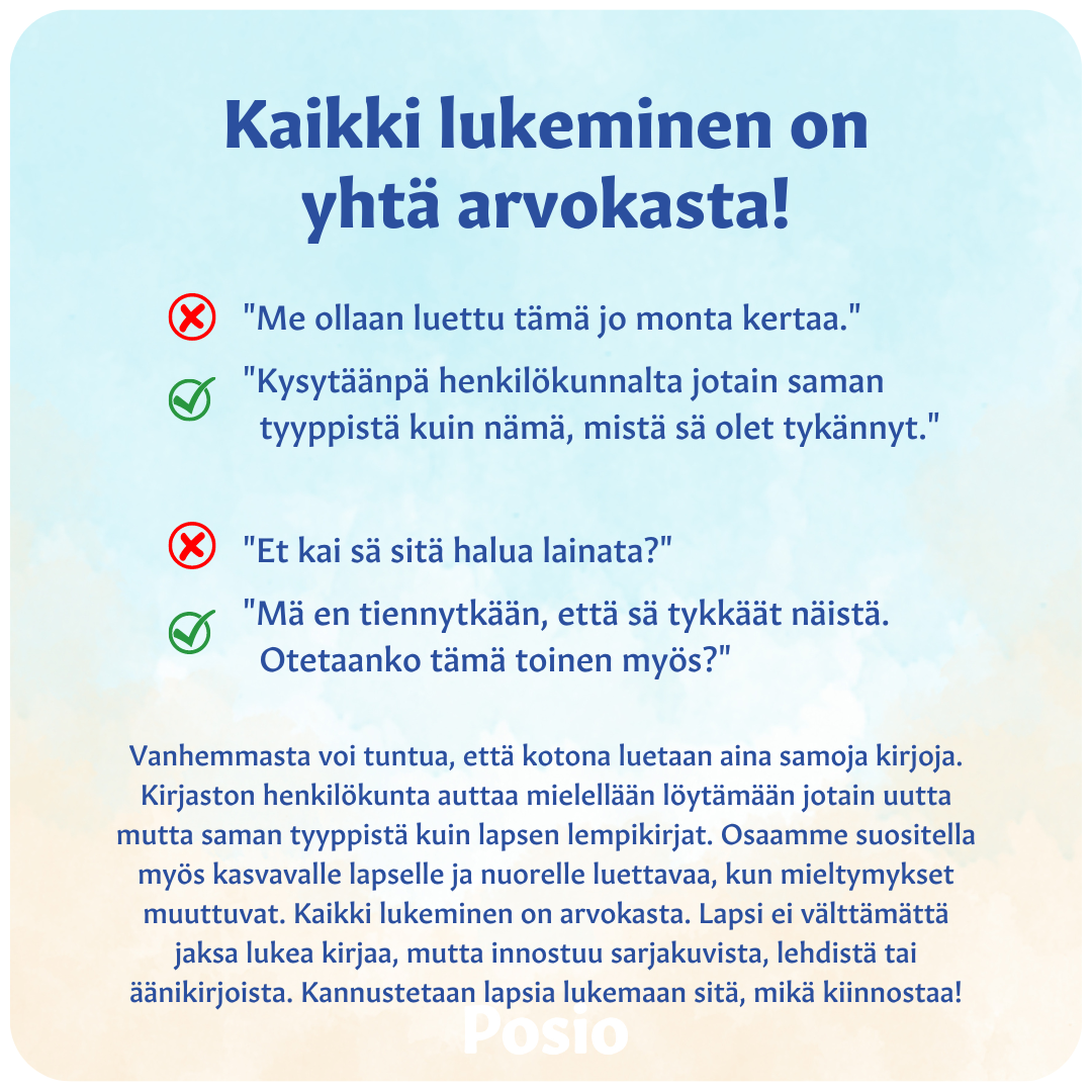 Kotona voi tuntua siltä, että lapsi haluaa aina lukea samoja kirjoja. Lapset luonnostaan arvostavat rutiinia ja tuttuja kokemuksia, mutta uudestaan ja uudestaan toistuvat kirjat voivat alkaa tuntua huoltajasta rasittavilta. Kirjaston henkilökunta on paikalla asiakkaita varten, ja auttaa takaan, että he auttavat mielellään löytämään uusia kirjoja yhteisiin lukuhetkiin.