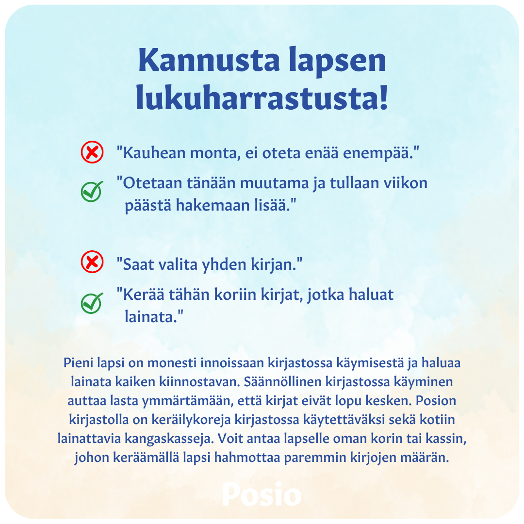 Pieni lapsi on monesti innoissaan kirjastossa käymisestä, ja haluaa lainata kaiken kiinnostavan. Lapselle on toisinaan sanottava “ei”, ja kirjastossakin tulee helposti sanottua, että ei enempää. Kannustamme kuitenkin keksimään sellaisia tapoja rajata lainausmäärää, jotka eivät viesti lapselle, että kirjoja on liikaa. Kirjastossa voit esimerkiksi antaa lapselle oman korin tai kassin, johon hän saa kerätä haluamansa kirjat. Koriin keräämällä lapsen on helpompi hahmottaa kirjojen määrä, ja tila on jo valmiiksi rajattu tiettyyn tilavuuteen. Myös säännöllinen kirjastossa käynti auttaa lasta pitemmällä aikavälillä ymmärtämään, että kirjat eivät lopu kesken, ja niitä voi aina hakea lisää.