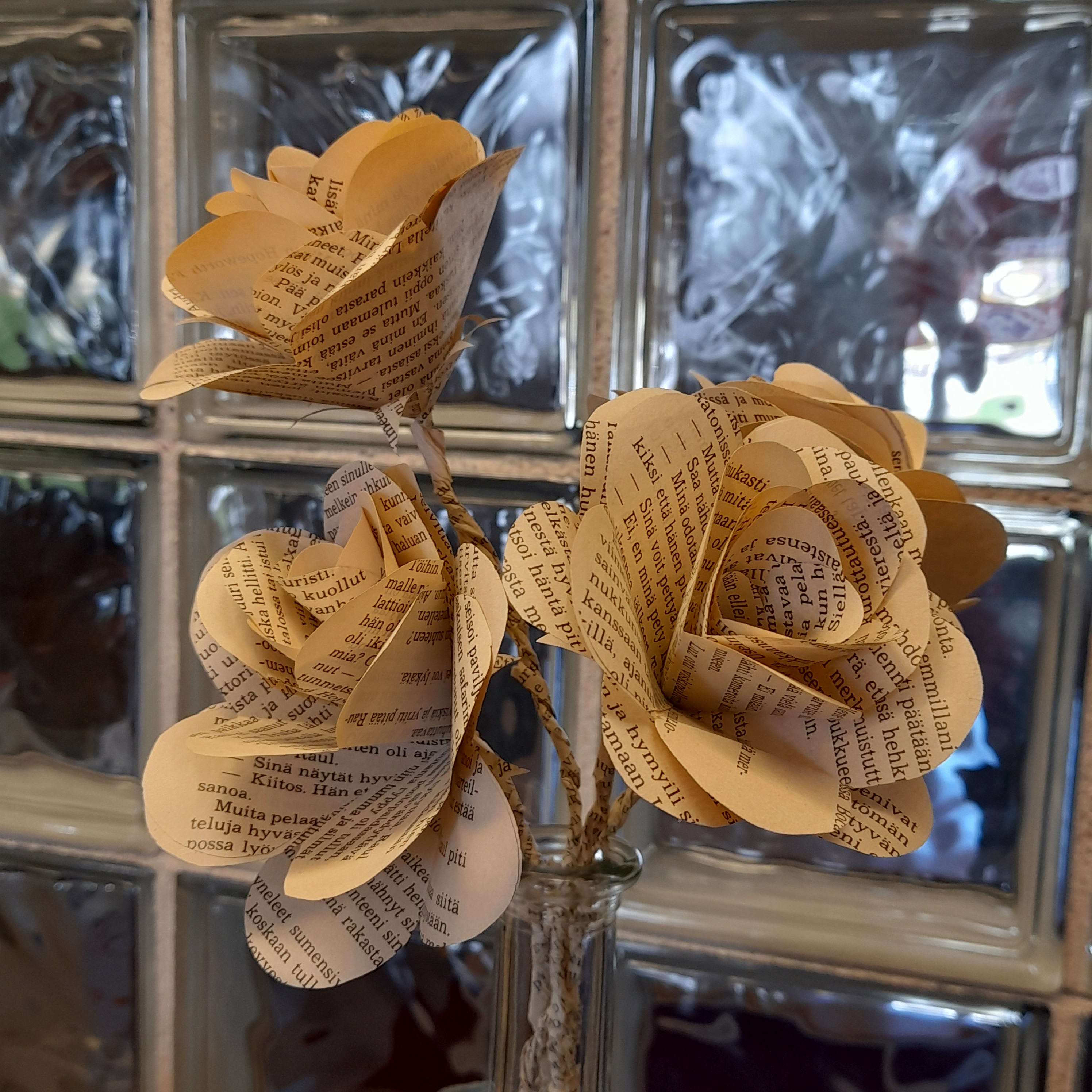 Jotkut kirjat jätetään varastoon odottamaan seuraavaa poistomyyntiä, mutta suuri osa on sellaisia, joiden tiedämme jäävän myymättä myöhemminkin. Kirjojen jatkojalostus askartelumateriaaliksi on luonnollinen seuraava askel. Sivuista voi taitella vaikka origameja tai tehdä ruusuja. Kansia voi käyttää maalausalustoina. Netissä on ohjeita vaikka millä mitalla. Yhdestäkin kirjasta riittää kuitenkin materiaalia moneen askarteluun, joten kaikkia kirjoja ei voi tätäkään tarkoitusta varten säästää.