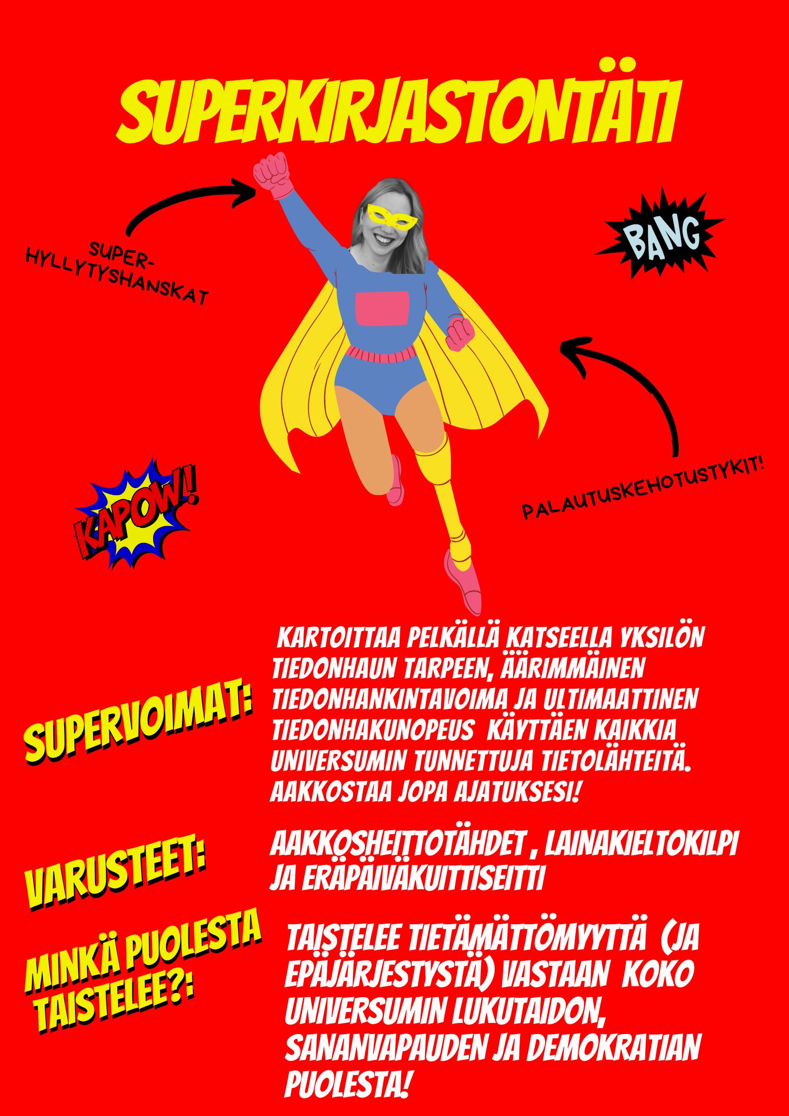 Meillä Sompion kirjaston Sodankylän toimipisteessä kutsuttiin alakoululaisia Supersankareita ja superkelmejä sanataidetyöpajaan. Sodankylän pääkirjastossa, Tähtikunnan koulun kirjastossa ja Savukosken kirjastossa oli Omatoimi-supersankaripiste, jossa saattoi pistäytyä suunnittelemassa oman sankarinsa. Kirjastoauton mukana pop-up supersankaripiste vieraili myös Pelkosenniemen koululla. Sanataidetyöpajoissa ja sankarisuunnittelupisteillä lapset (ja aikuisetkin toki!) saivat pohtia sankaruuden ja kelmiyden ydintä. Saimme luvan käyttää sanataideyhdistys Yöstäjän supersankarimateriaalia. Supersankarin saattoi kuvata piirtämällä tai sanoin, keksiä sille nimen, arkiroolin, salaisen tukikohdan ja merkityksellisen taustatarinan. Kuten meillä ihmisillä myös supersankareilla on oma merkityksellinen elämäntarinansa, joka on muokannut heistä sen henkilön, joka he ovat. Monilla supersankareilla on taustallaan lapsuuden menetyksiä, jotka ovat saaneet heidät taistelemaan oikeuden puolesta. Toisaalla sankarien arkkivihollisillakin on näitä kovia kokemuksia, jotka ovat tehneet heistä yhteiskunnan vihollisia. Taustatarina on siis tärkeä ihmisille ja inhimillisille sankareille.