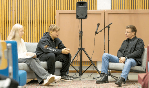 Lukiolaiset Elli Hirsikangas ja Niklas Karlsen haastattelivat näyttelijä, ohjaaja ja kirjailija Peter Franzenia. Kuva Eva Kaján.