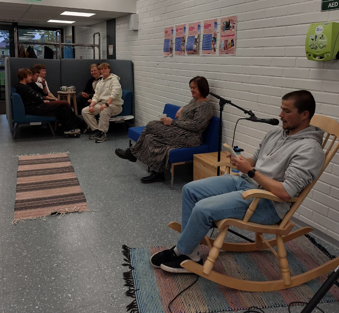 Ennen syyslomaa vietimme lukuviikkoa oppilaitoksessa. Aula muutettiin viihtyisäksi oleskelutilaksi matoilla, sohvilla ja viherkasveilla.  Poistokirjoista koottiin näyttävä näyttely ja POP UP -kirjasto toi kirjavalikoimaa esille aulaan. Ruokavälitunneilla opiskelijoiden toivomat henkilökunnan jäsenet lukivat ääneen.
