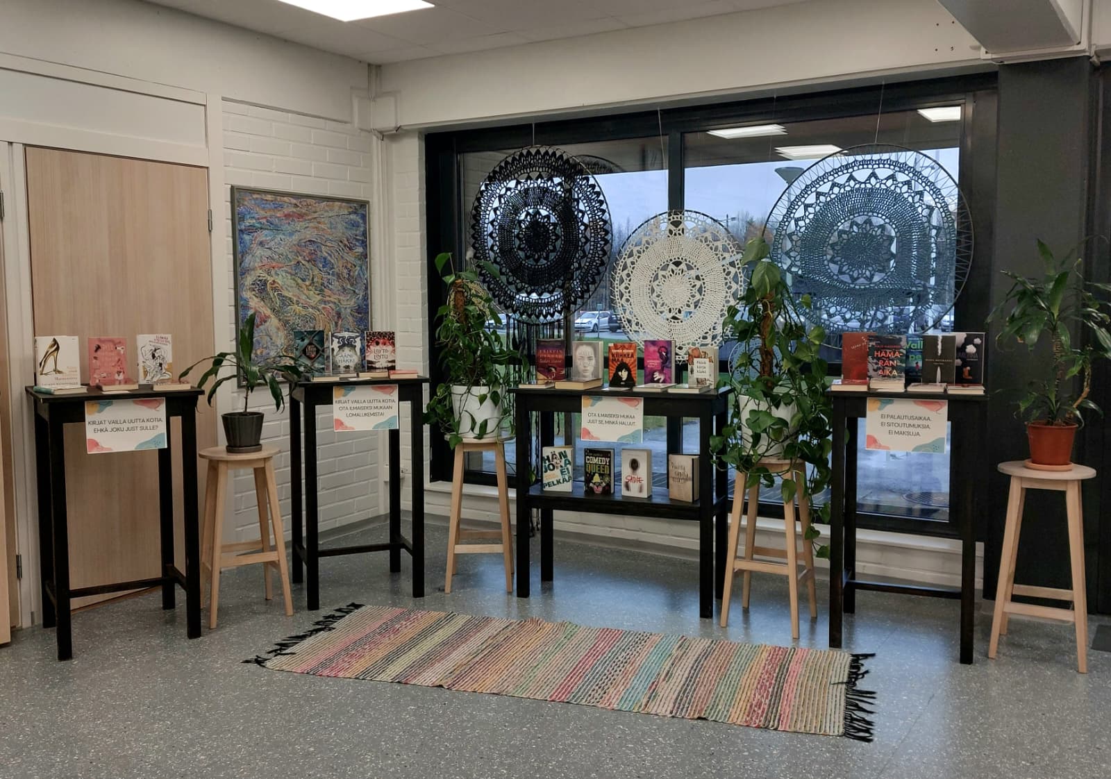 • Poistokirjanäyttelyt: Olen koonnut nuorille aikuisille sopivista poistokirjoista pienet kokoelmat asuntolaan ja oppilaitoksen aulaan – ja päivitän niitä säännöllisesti. Kirjoja katoaa hyllyistä mukavasti!