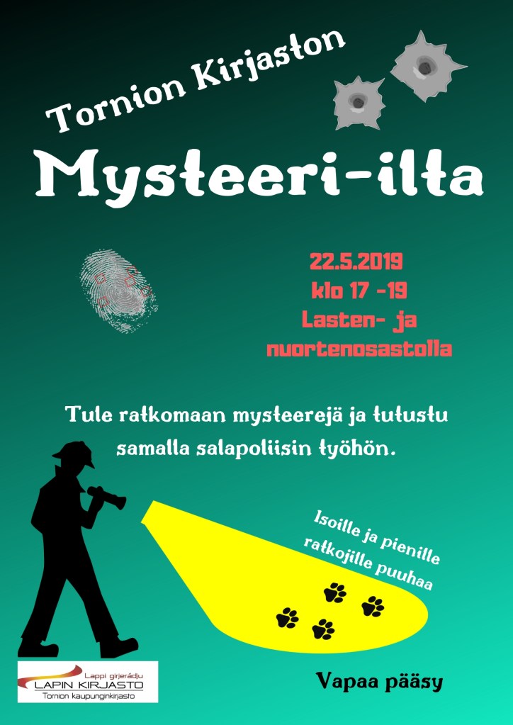 Tornion kirjaston Mysteeri-ilta on koko perheen tapahtuma, joka järjestetään tänä vuonna 22.5 klo 17–19 lasten- ja nuortenosastolla.