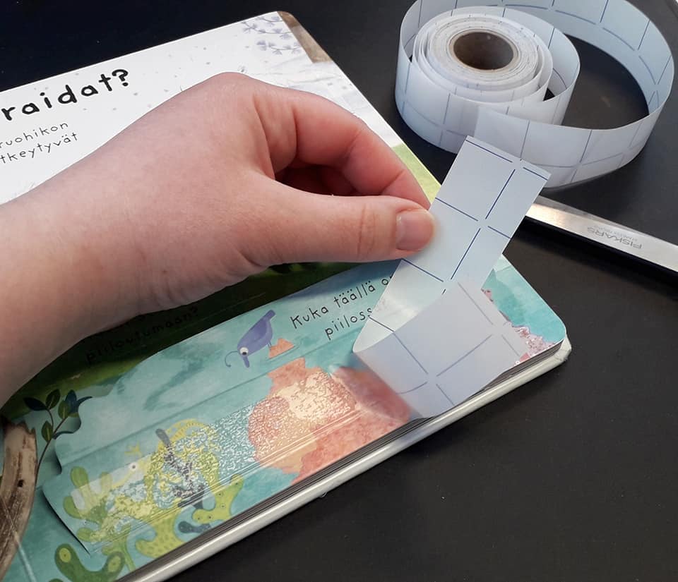 Monet kirjastot ovat julkaisseet somessa viime viikkoina paljon kuvia siitä, mitä siellä tiskin takana ja takahuoneissa oikein tehdään. Tässä vahvistetaan muovilla lasten luukkukirjan luukkuja.