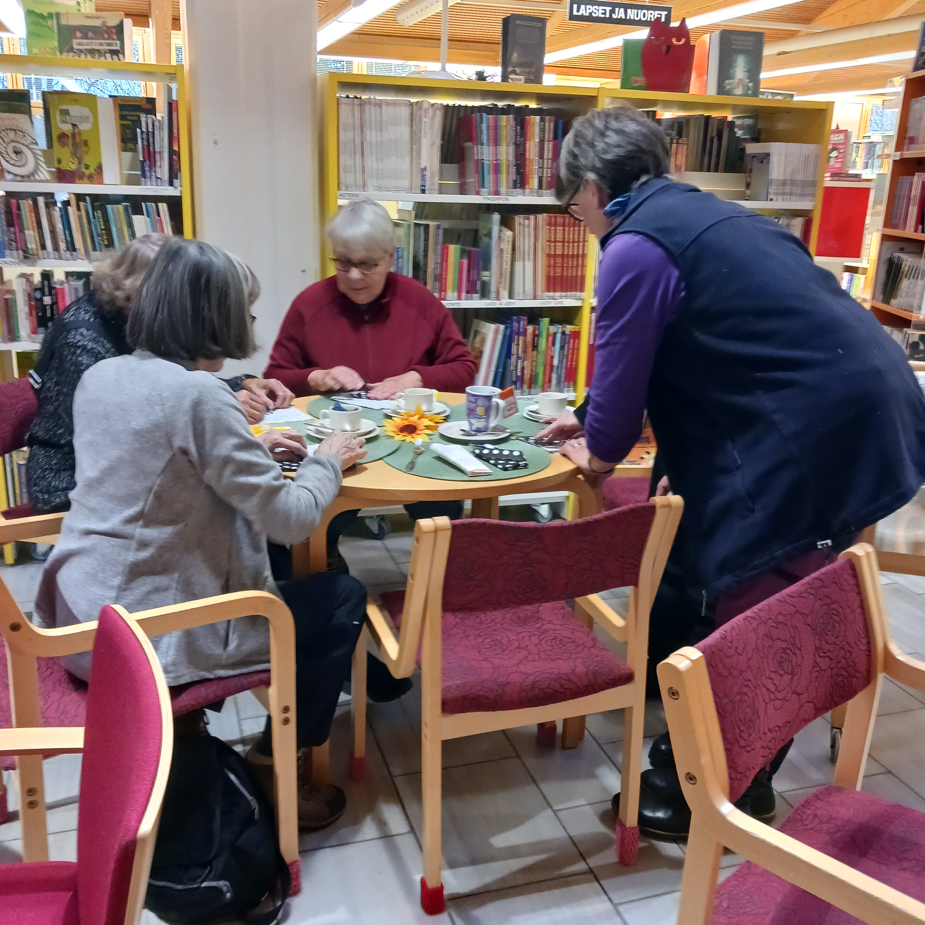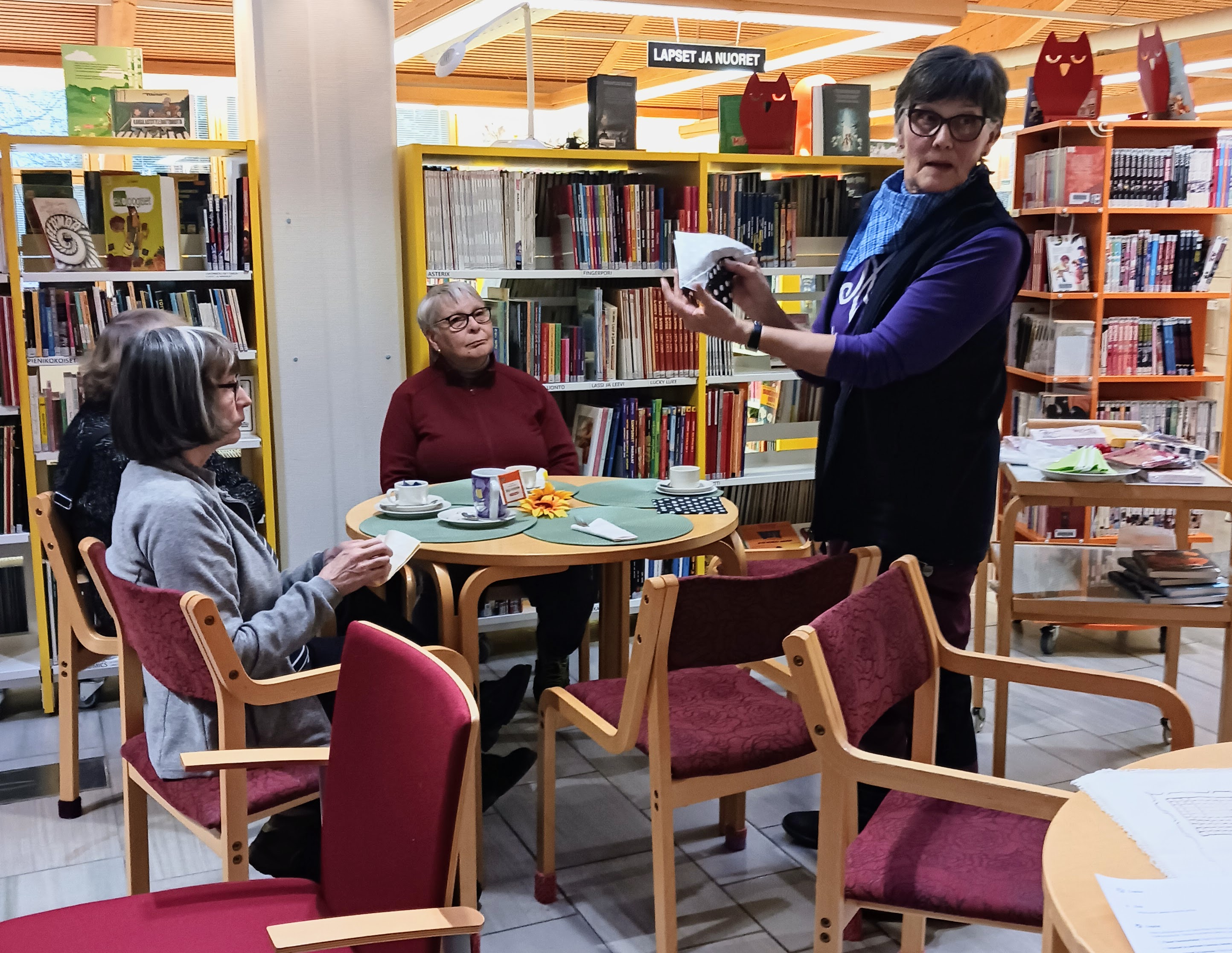 Tiistain on meillä TeemaTiistai – joka tiistai-ilta kello 17 kirjastossa tapahtuu jotain. Nyt vanhusten viikon teeman mukaan teimme Arjesta juhlaa – opettelimme kahviliinojen taitteluja Marttojen Pirkon johdolla ja joimme hyvät kakkukahvit. Kirjaston vakituinen Sisu-vieras pääsi Mirvan syliin… Kävimme myös paikallisessa kaupassa mainostamassa kirjaston palveluja, esim. esinelainausta.