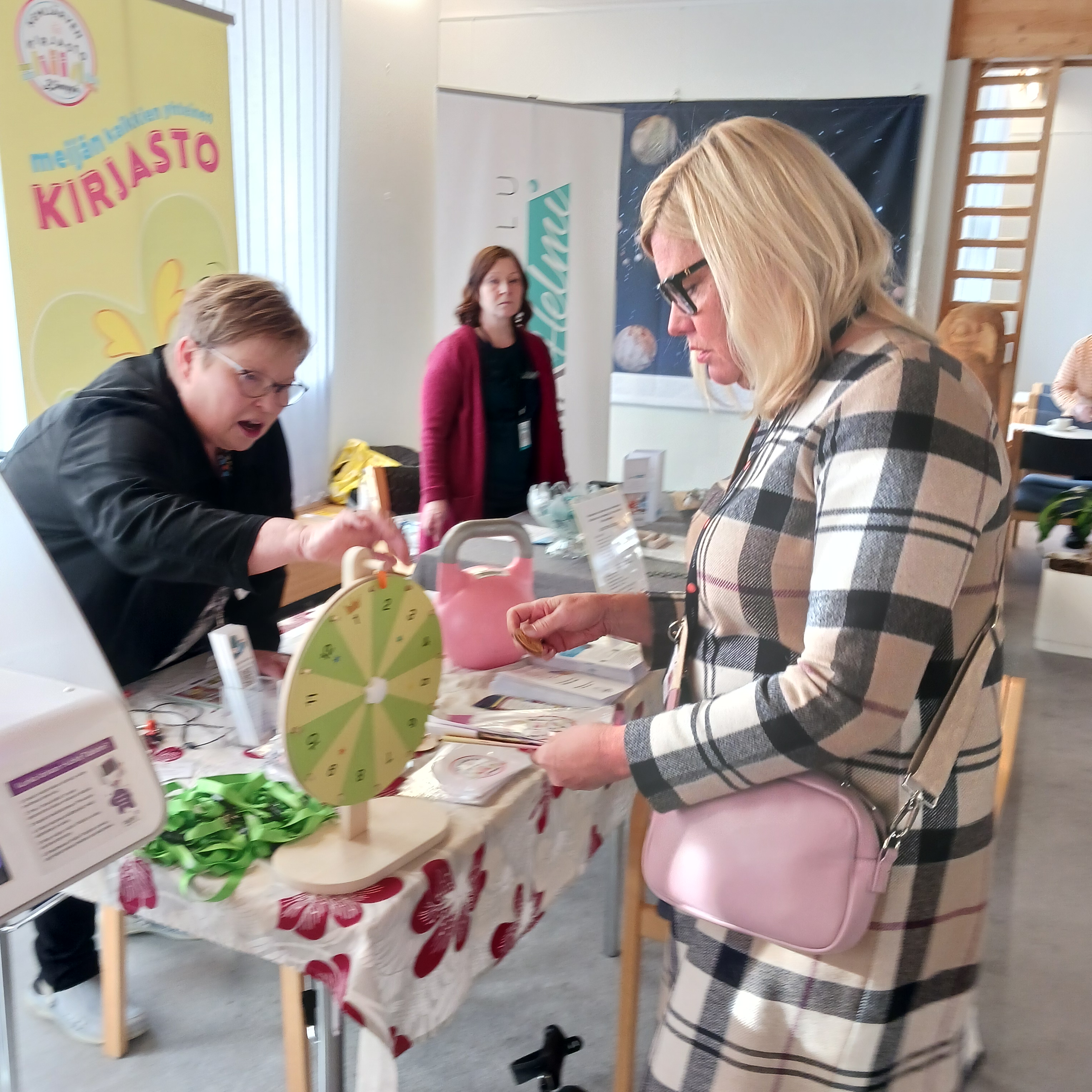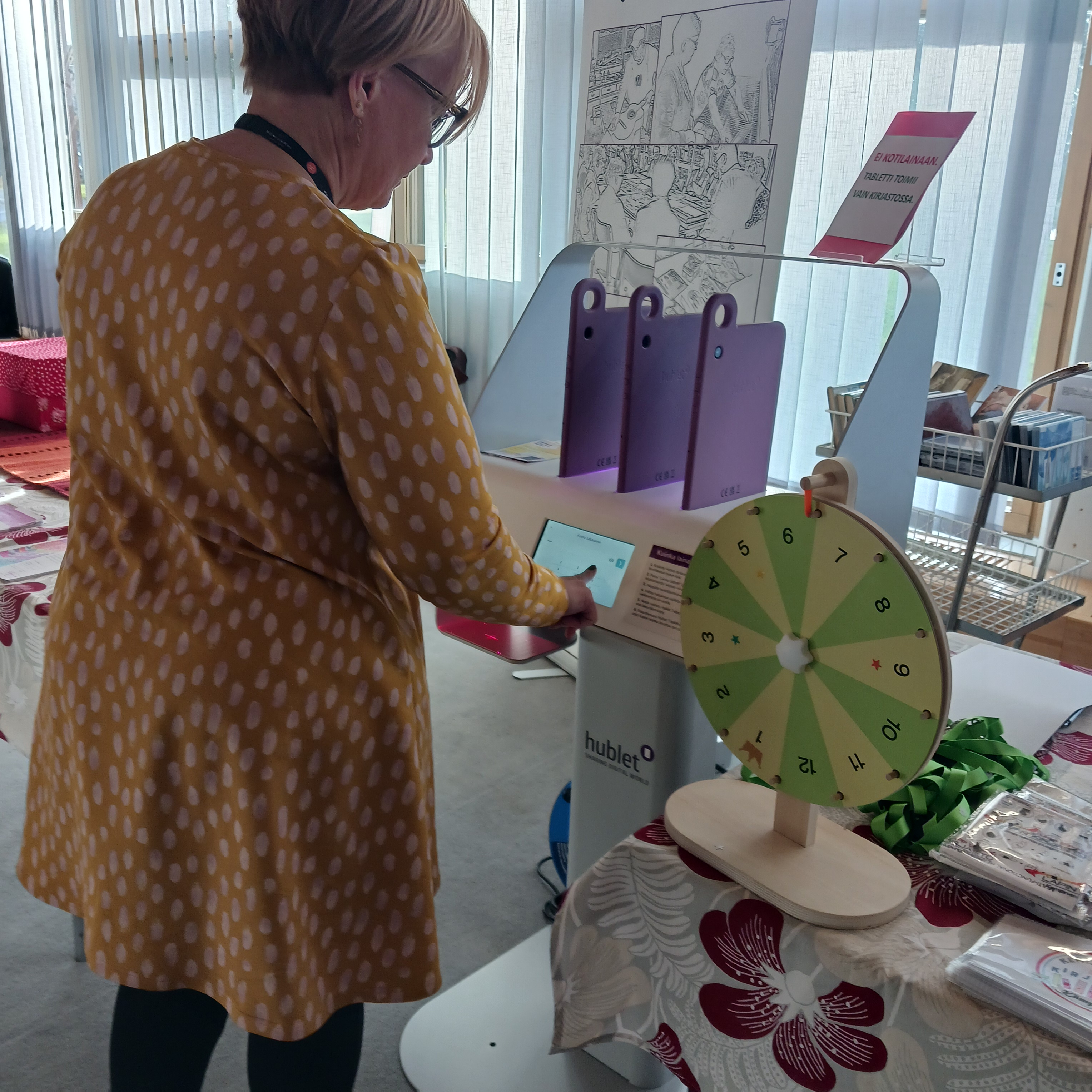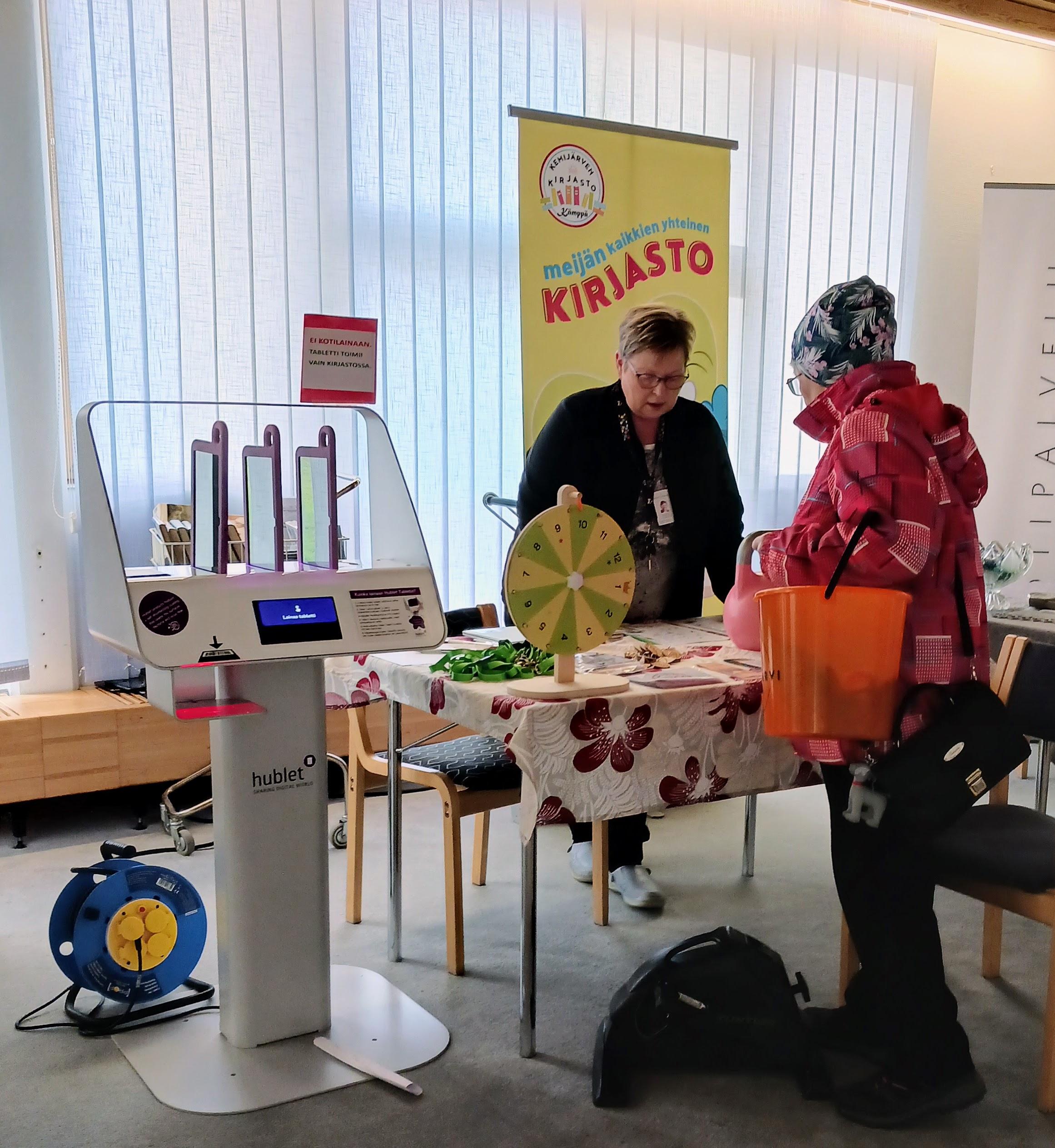 Keskiviikkona kirjastolaiset olivat Vanhusten viikon päätapahtumassa mukana. Kulttuurilämpiön kirjastopisteeseen tutustui mm. kansalaisopiston rehtori ja kaupunginjohtajakin pyöritti onnenpyörää. Toimme tilaisuuteen uuden askellaitteen eli restoraattorin sekä Hubletit. Mainostimme e-aineistoja ja kotipalvelua. Eniten kuitenkin houkutteli onnenpyörästä saatavat palkinnot 🙂