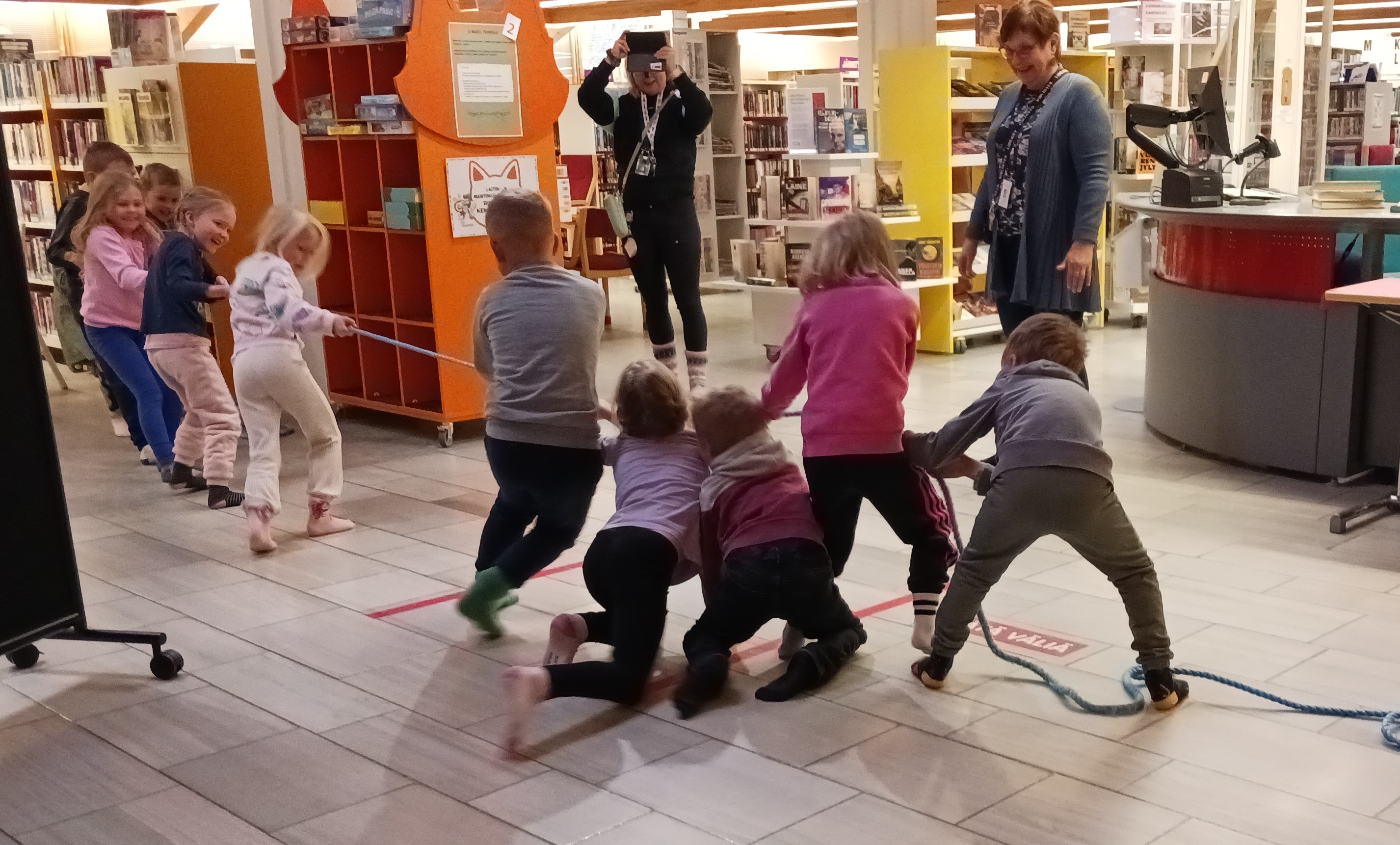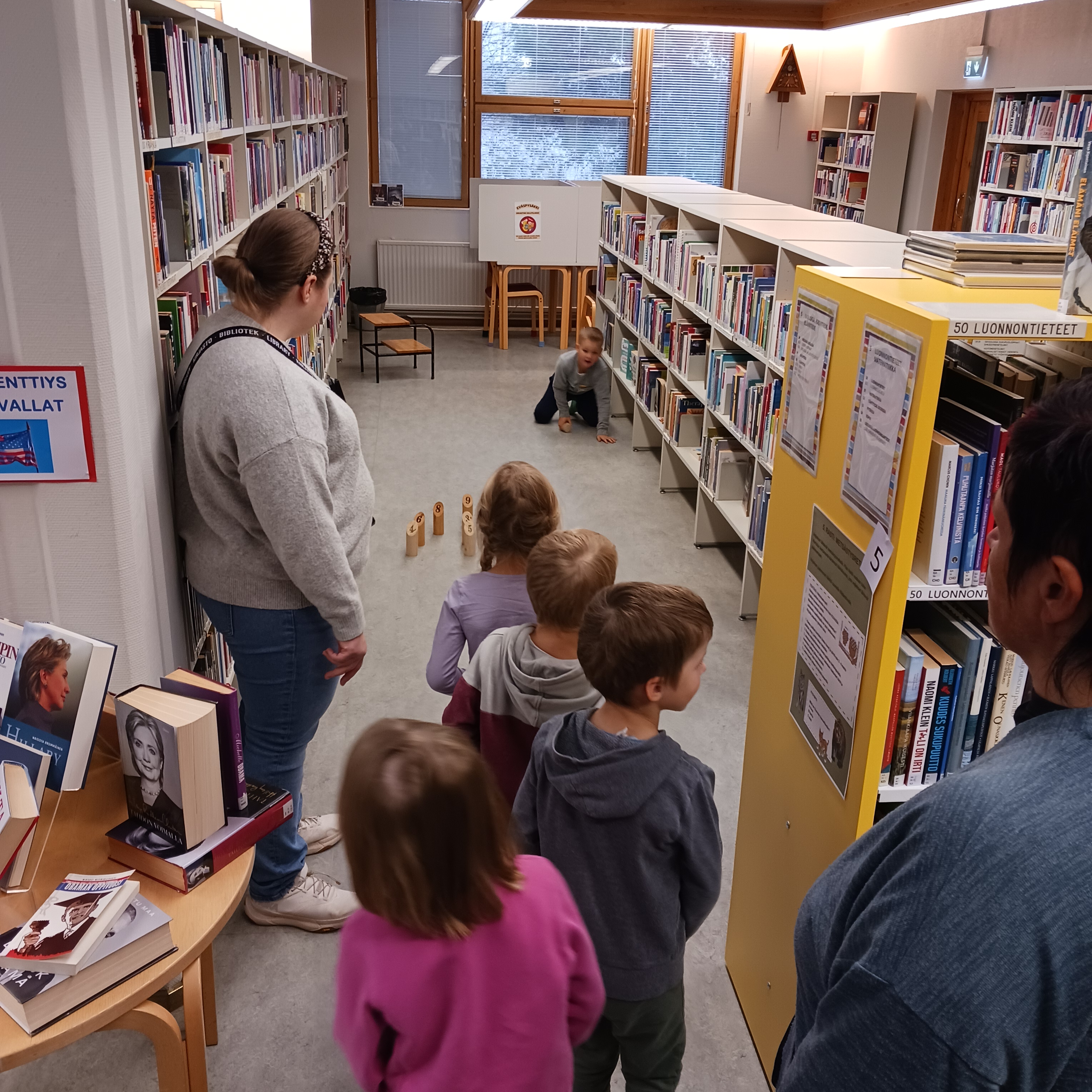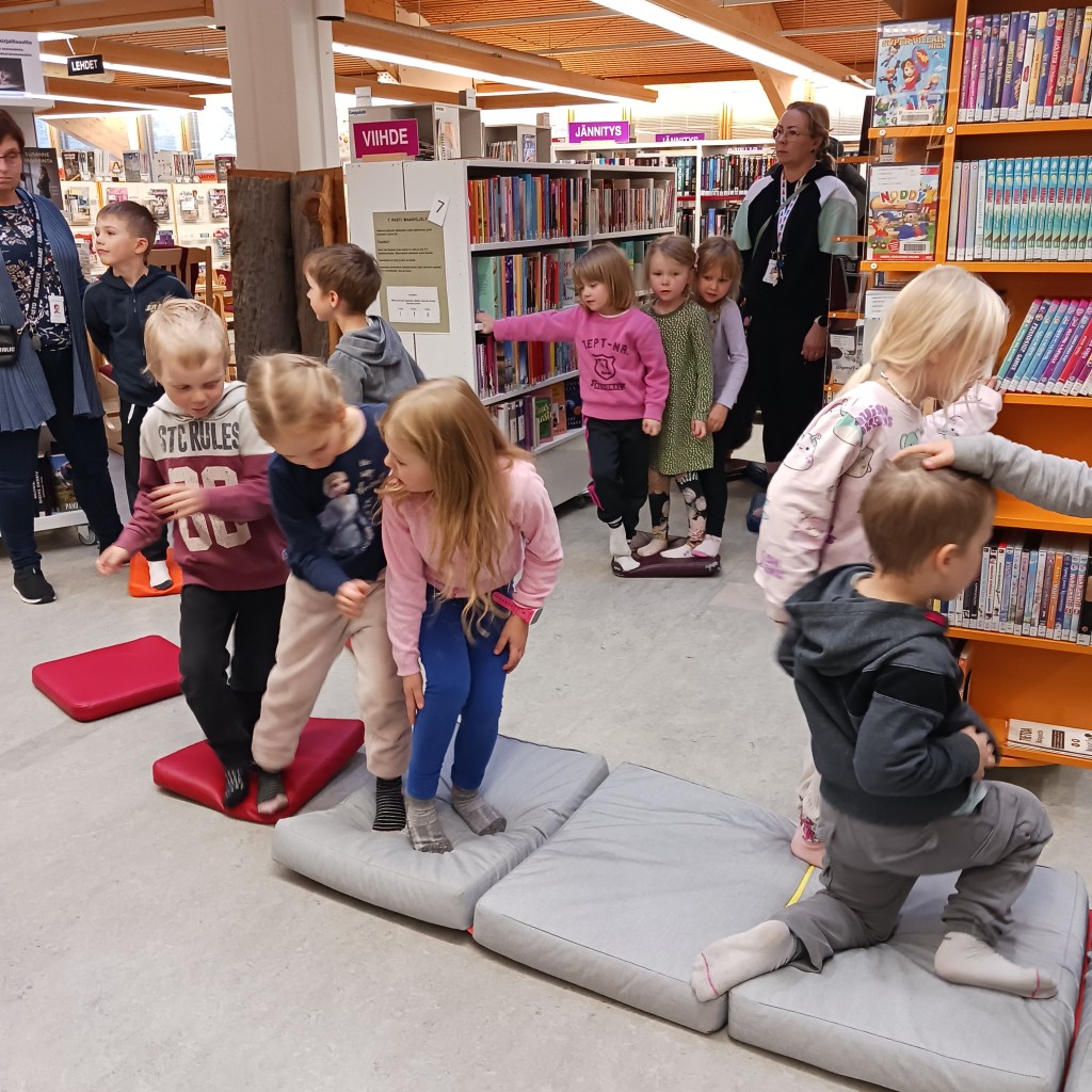 Torstaina vietimme Aleksis Kiven päivää. Irmeli ja Marru olivat tehneet kirjastoon 8-kohtaisen radan, jota suorittamaan tulivat Jyvälän päiväkodin eskarit.