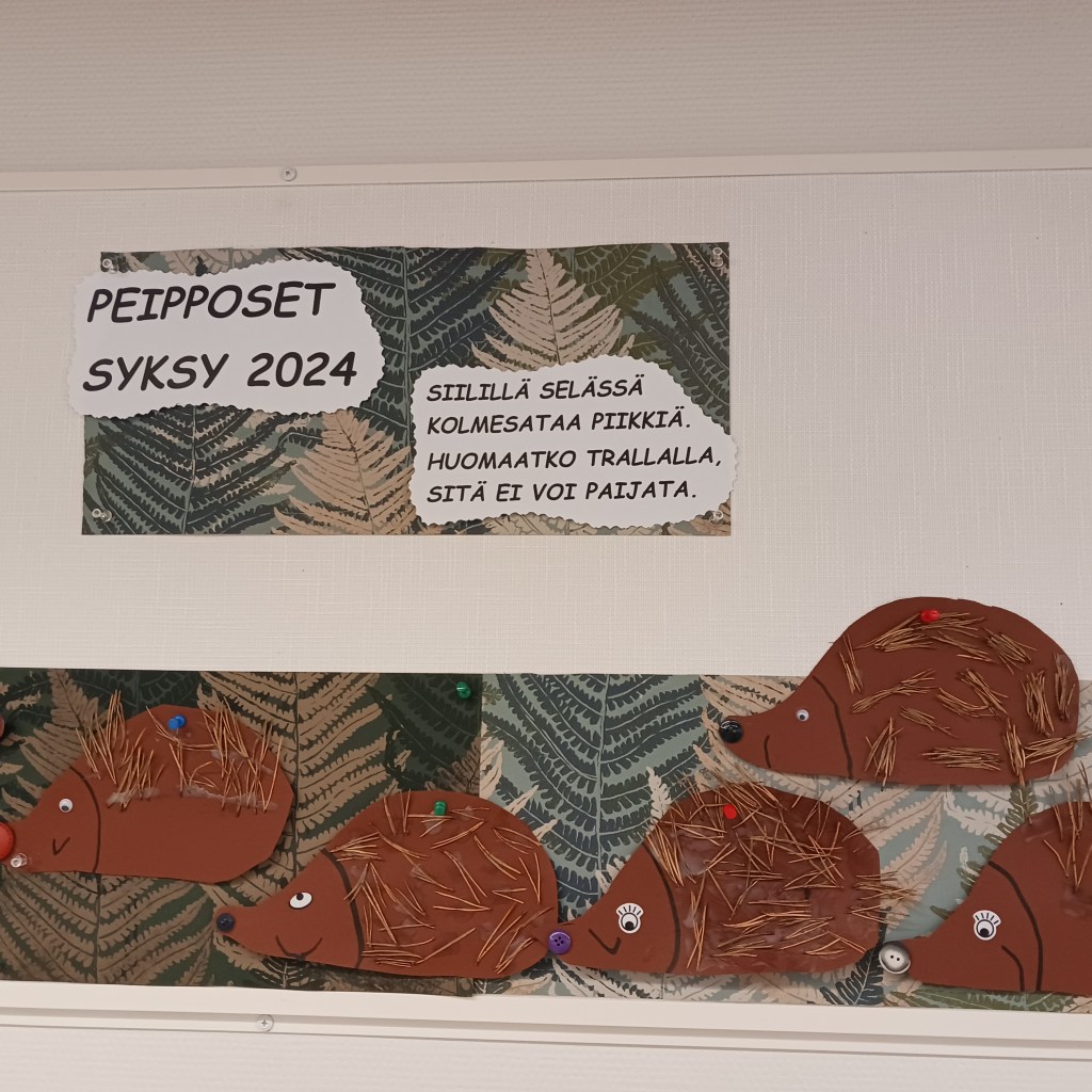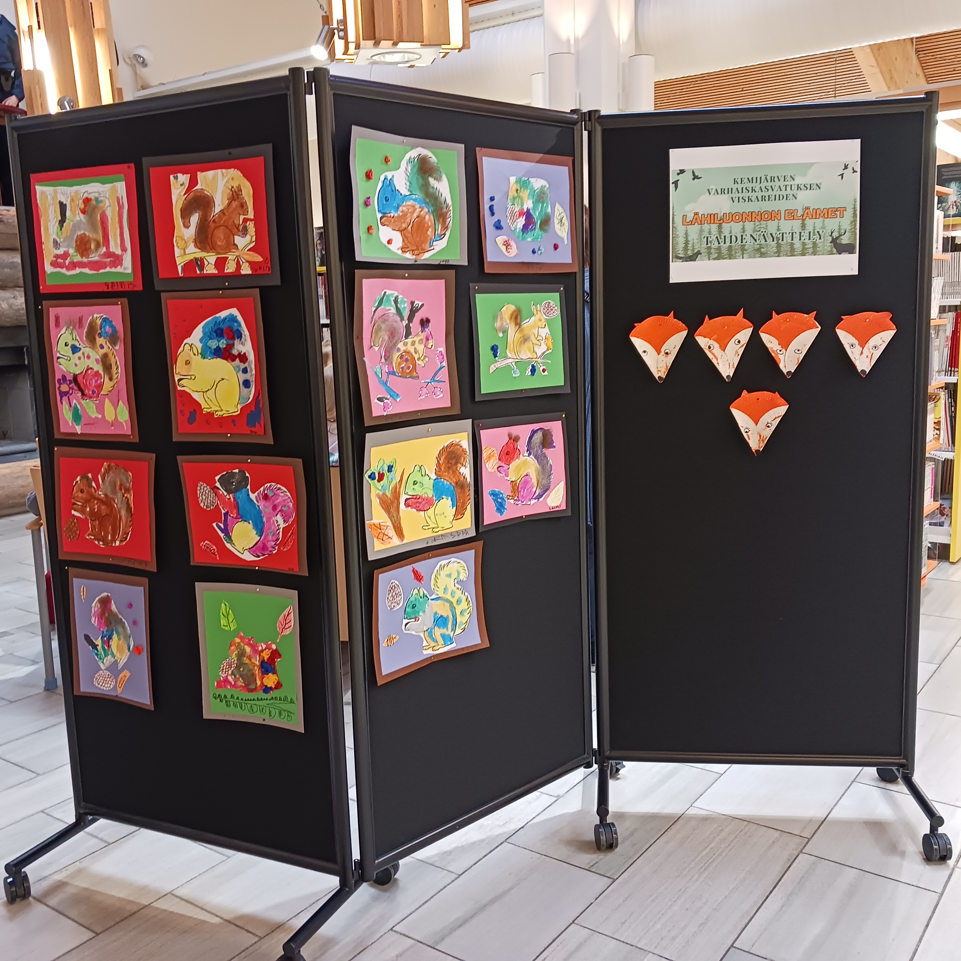 Vanhusten viikko oli myös Eläinten viikko, ja viskarit toivat maanantaina näyttelyn kirjastoon – ei ollut hiljaista ei! Työt olivat kyllä hienoja!